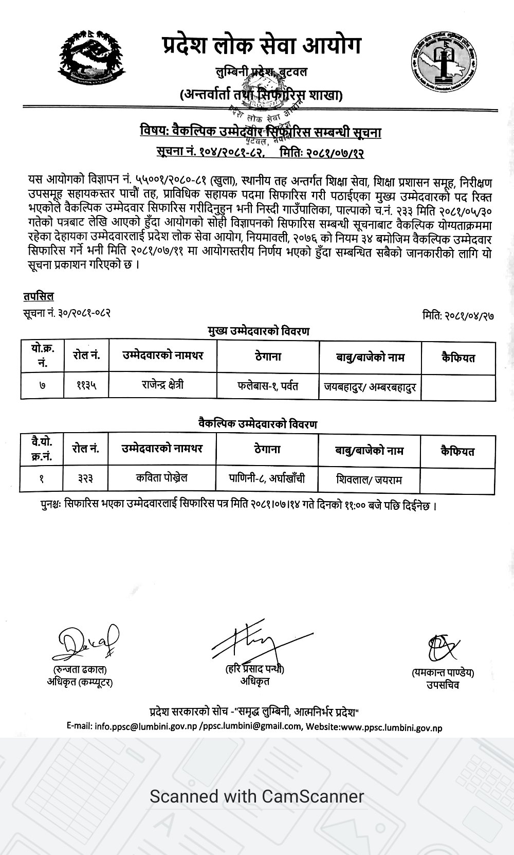 आयोगको विज्ञापन नं. ५५००१/२०८०-८१ (खुला), स्थानीय सरकारी सेवा अन्तर्गत शिक्षा सेवा, शिक्षा प्रशासन समूह, निरीक्षण उपसमूह, सहायकस्तर पाचौं तह, प्राविधिक सहायक पदको वैकल्पिक उम्मेदवार सिफारिस सम्बन्धी सूचना ।