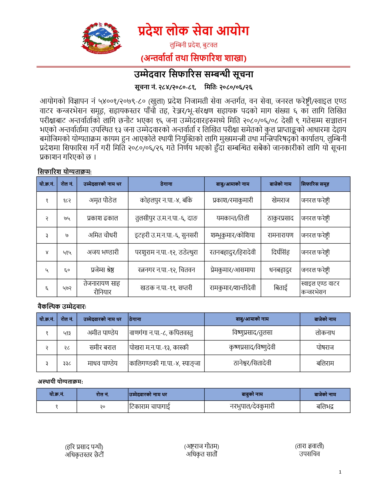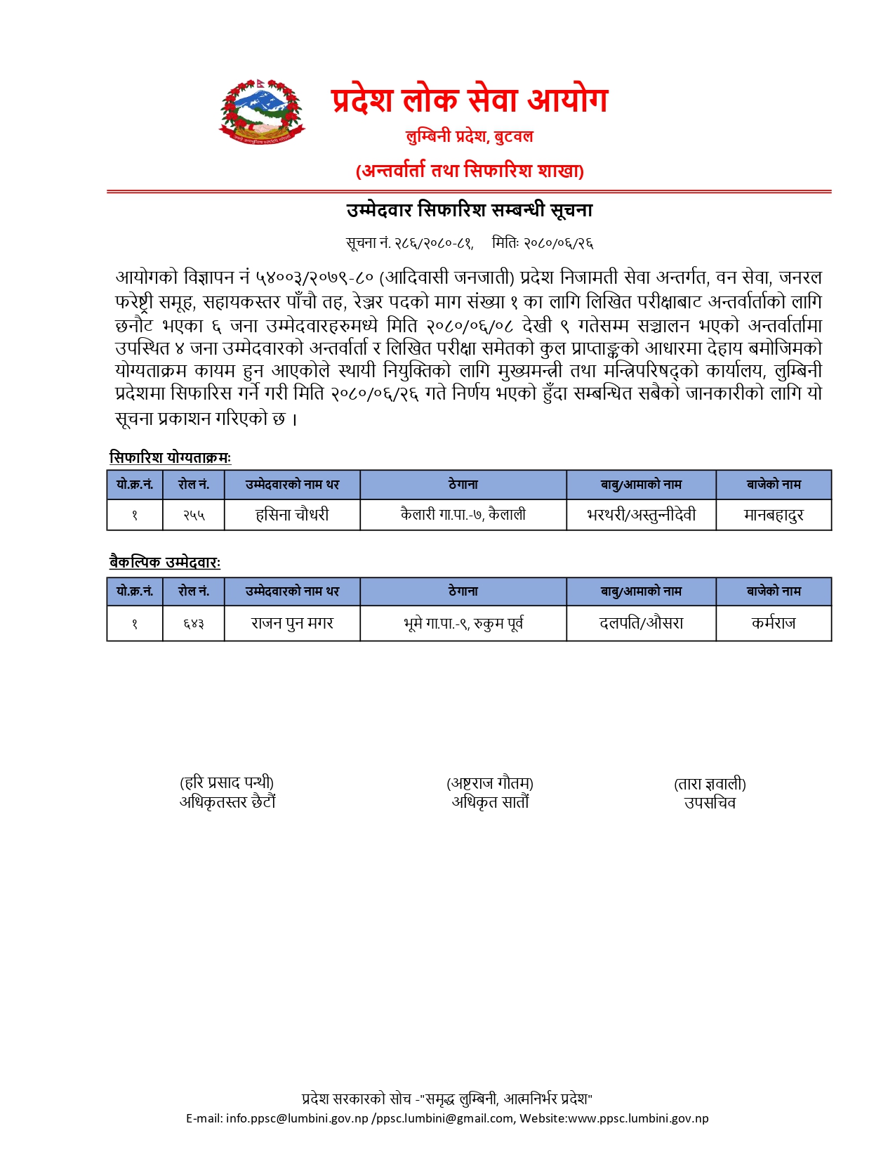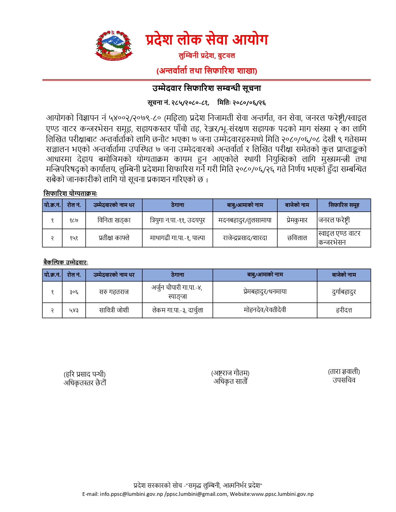 वि. नं ५४००२/२०७९-८० (महिला) प्रदेश निजामती सेवा अन्तर्गत, वन सेवा, जनरल फरेष्ट्री/स्वाइल एण्ड वाटर कन्जरभेसन समूह, सहायकस्तर पाँचौ तह, रेञ्जर/भू-संरक्षण सहायक पदको सिफारिस सम्बन्धी सूचना