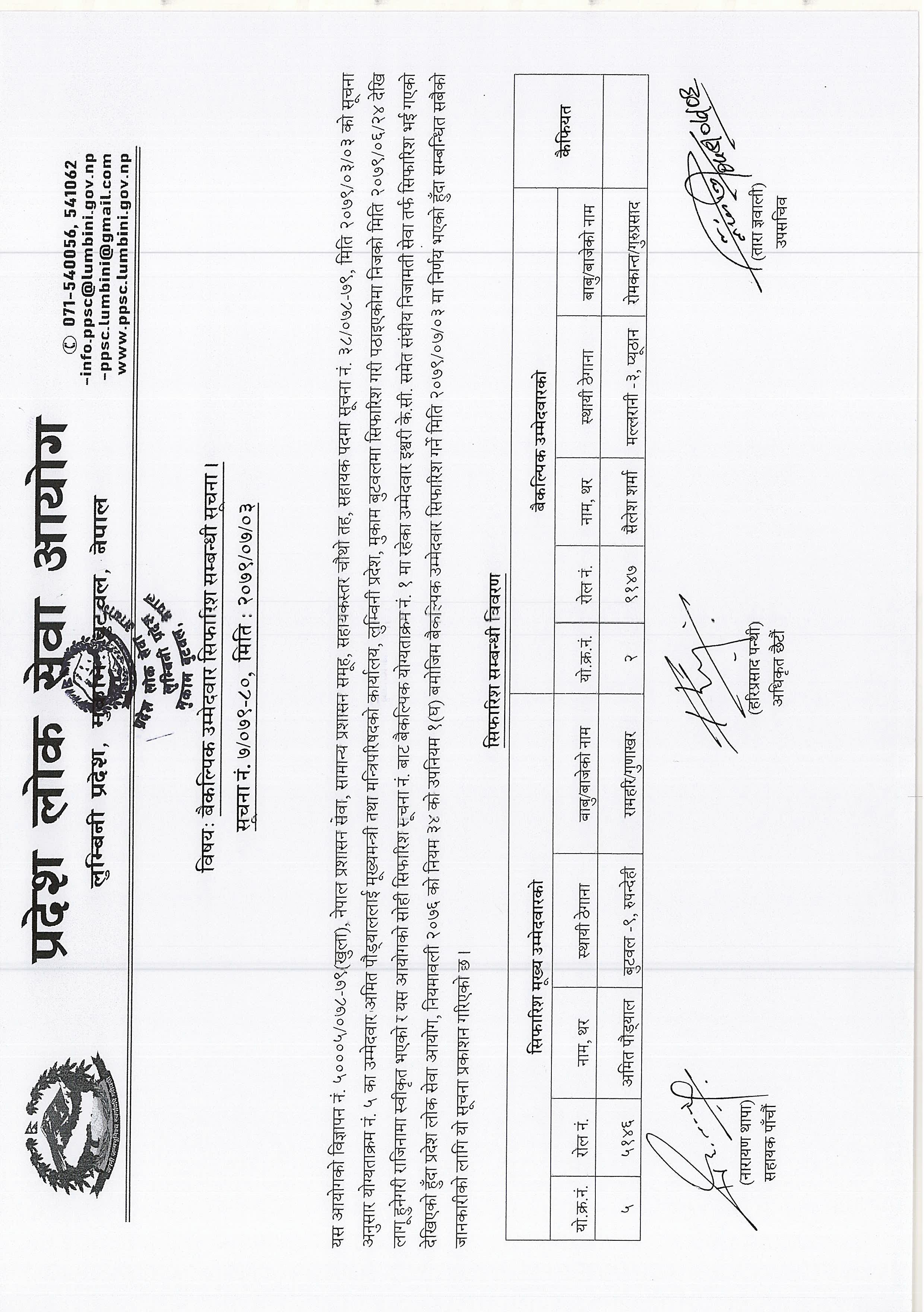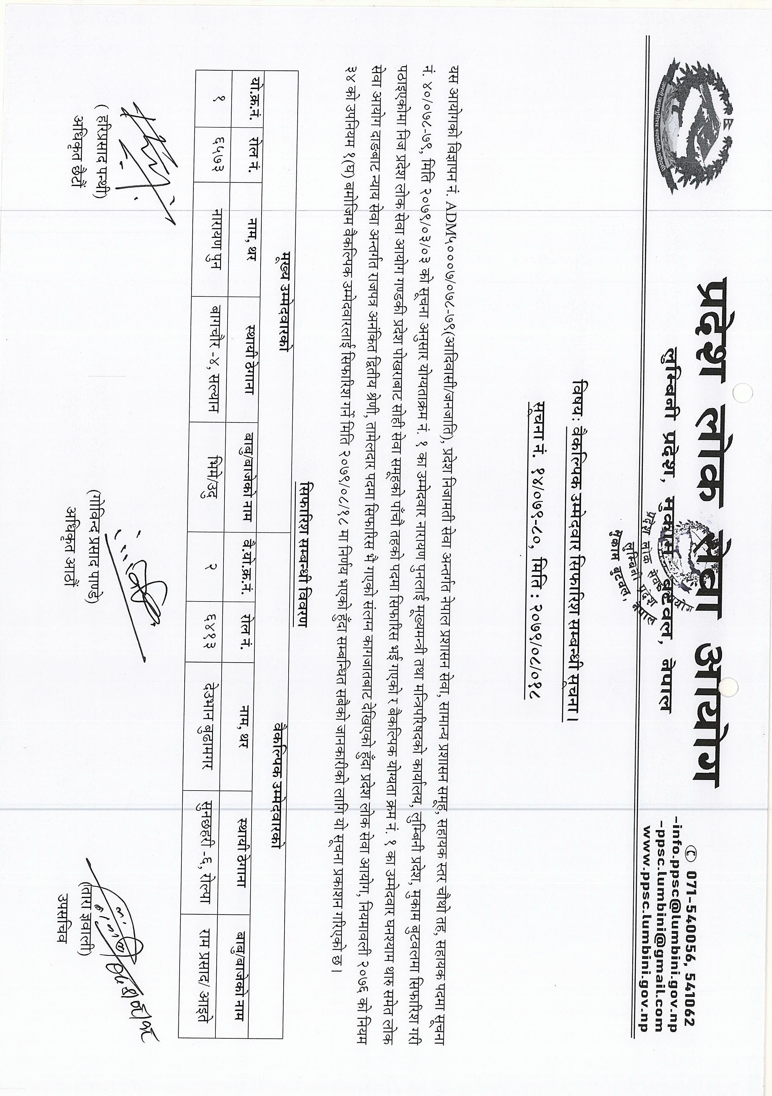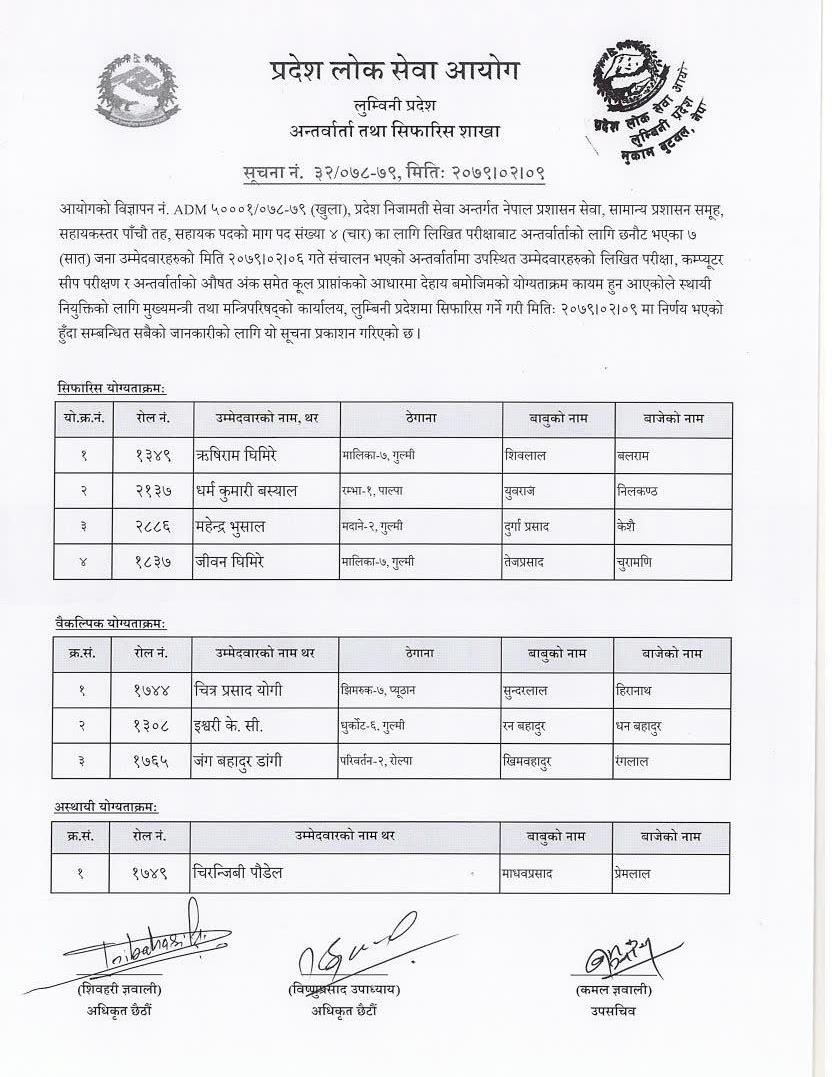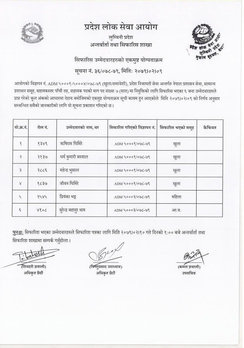 वि.नं. ADM ५०००५/०७८-७९ (खुला), प्रदेश निजामती सेवा अन्तर्गत नेपाल प्रशासन सेवा, सहायकस्तर चौथो तहको सिफारिस सूचना ।
