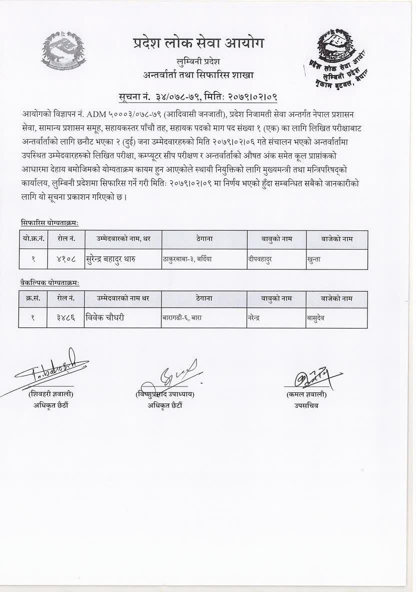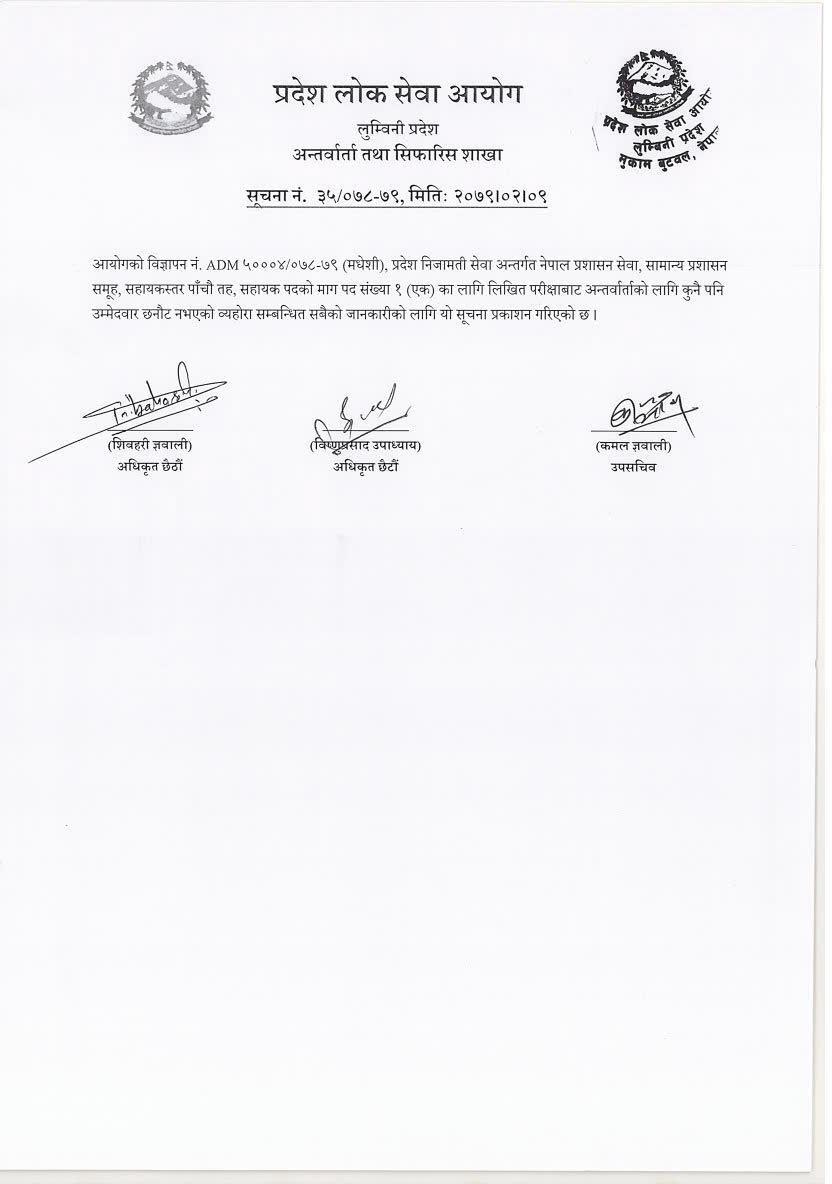 वि. नं. ADM ५०००३/०७८-७९ (आ.ज.), प्रदेश निजामती सेवा अन्तर्गत नेपाल प्रशासन सेवा, सामान्य प्रशासन समूह, सहायकस्तर पाँचौ तह, सहायक पदको सिफारिस सम्बन्धी सूचना