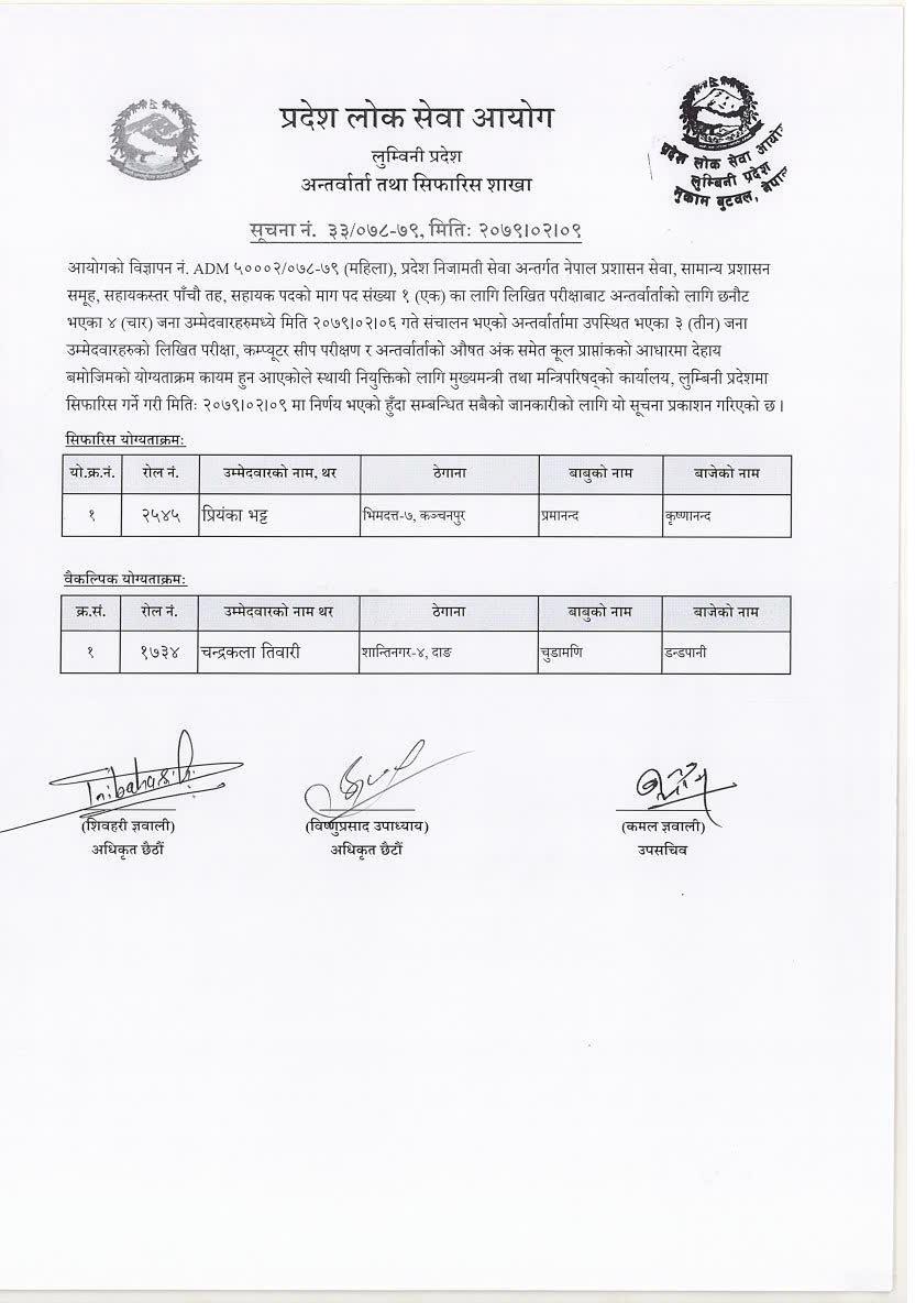 वि. नं. ADM ५०००२/०७८-७९ (महिला), प्रदेश निजामती सेवा अन्तर्गत नेपाल प्रशासन सेवा, सामान्य प्रशासन समूह, सहायकस्तर पाँचौ तह, सहायक पदको सिफारिस सम्बन्धी सूचना